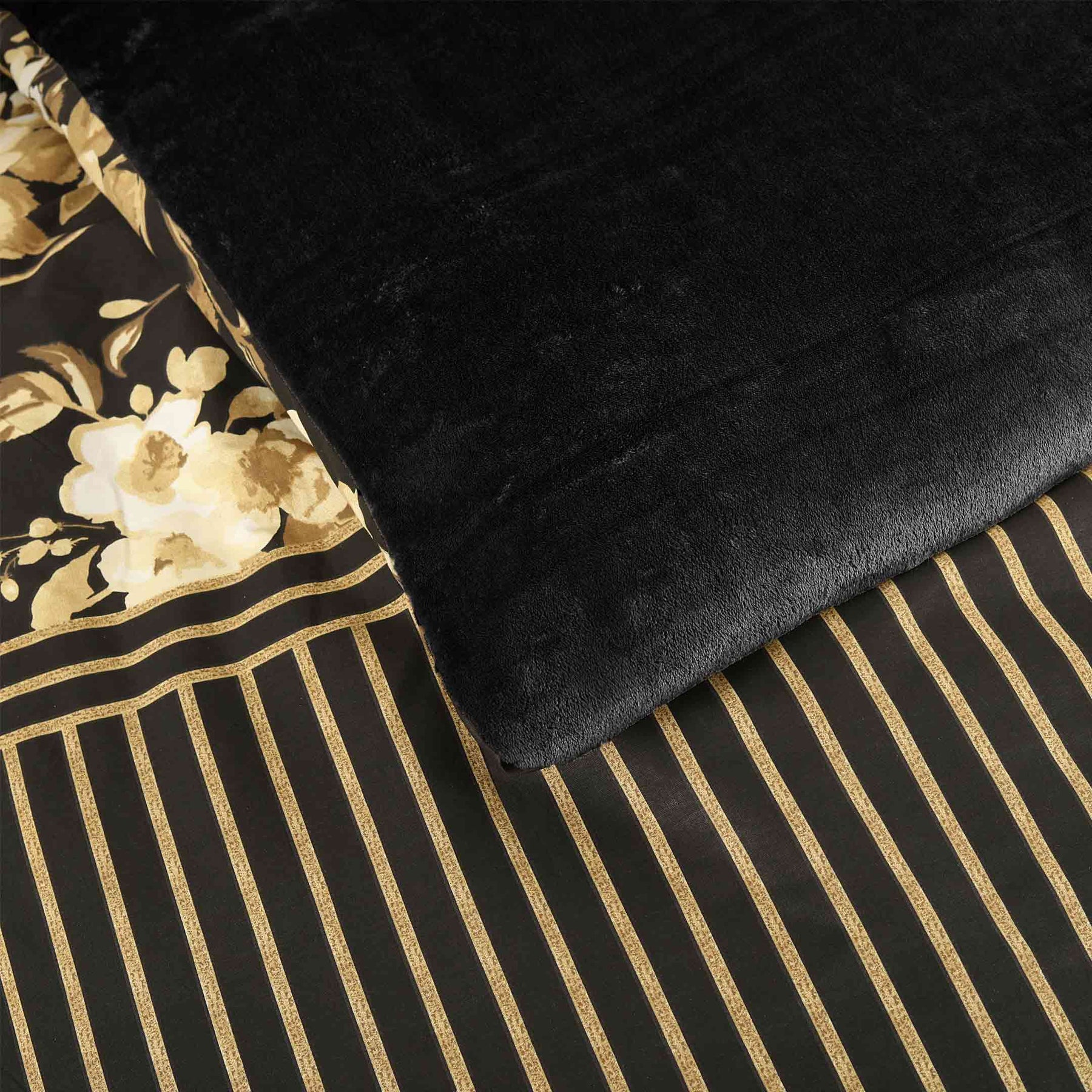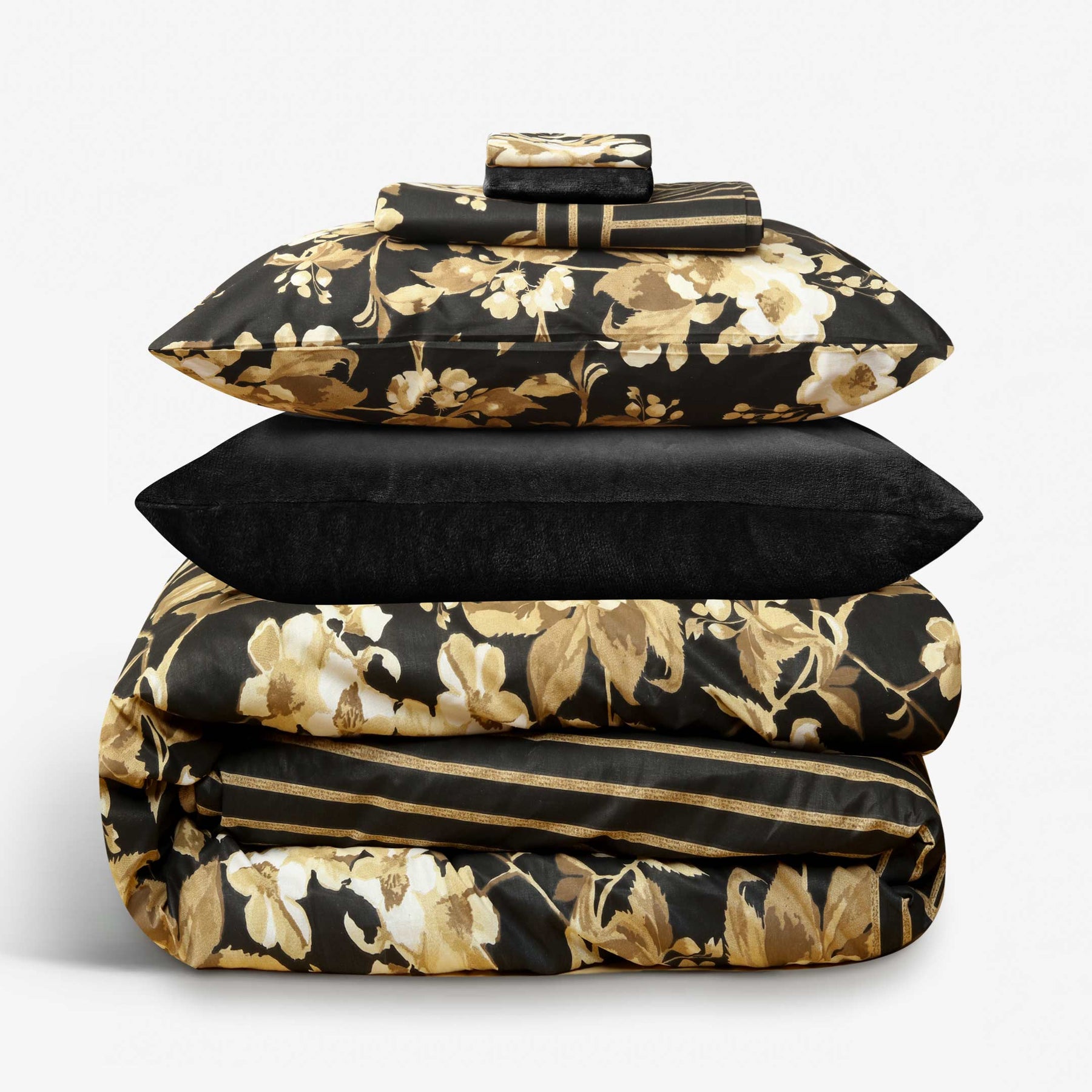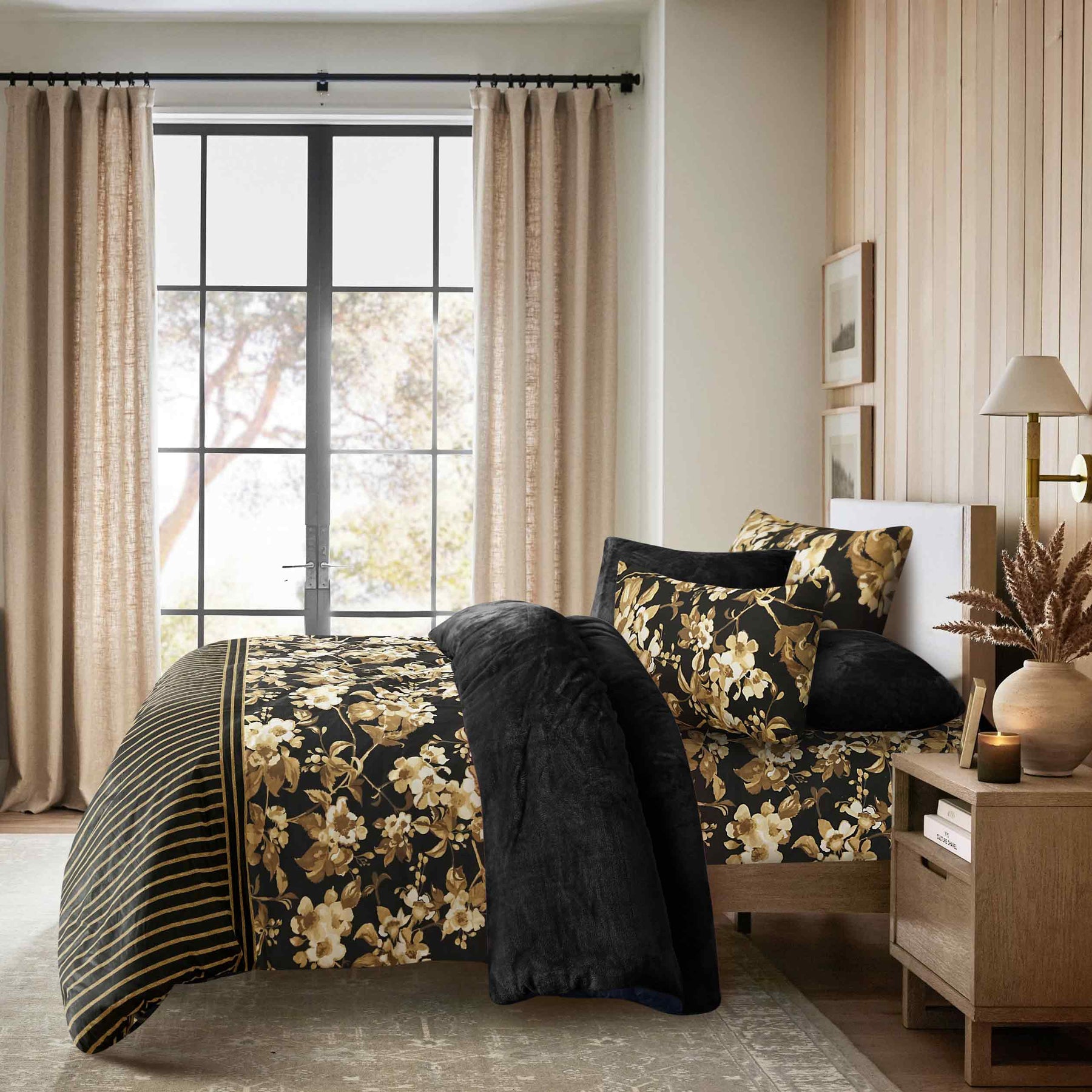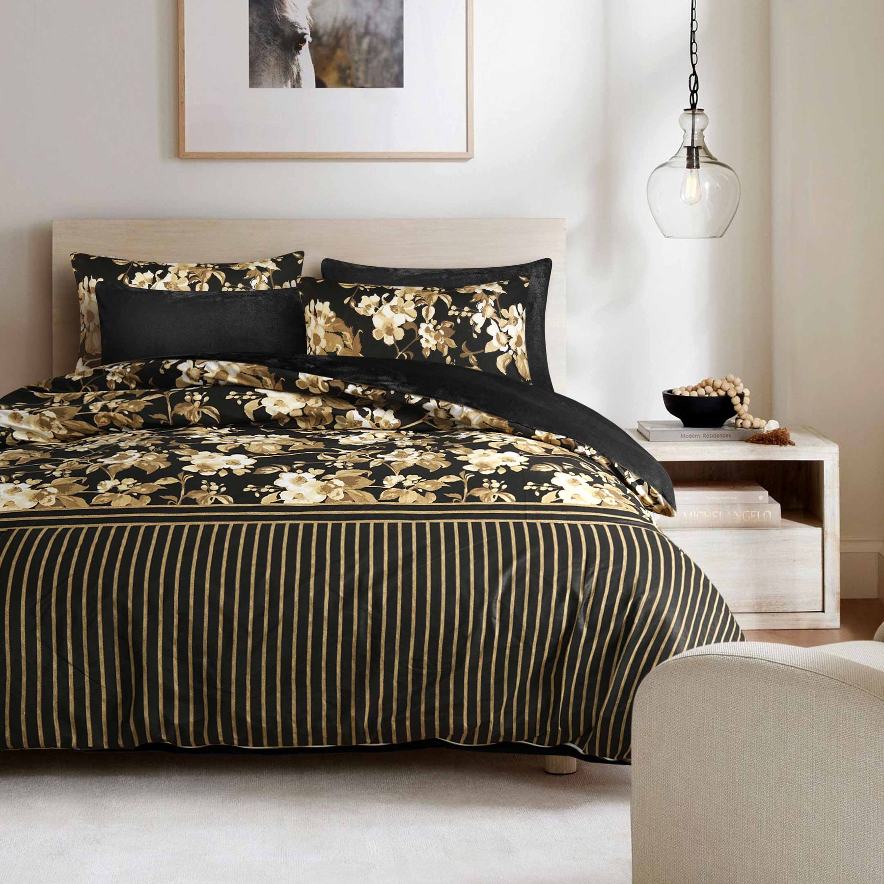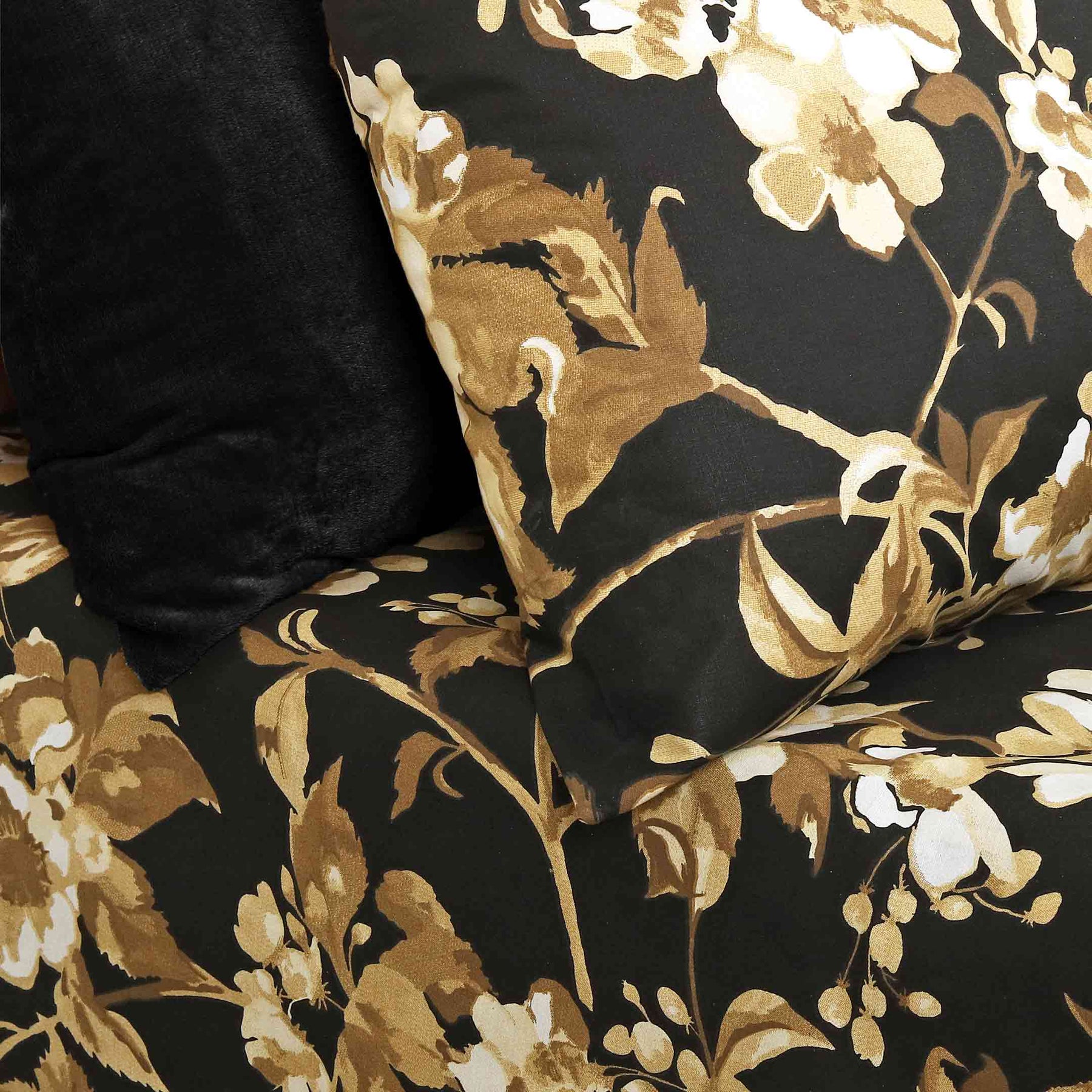 A luxurious razaye set featuring bold gold floral prints on a black background, complemented by a soft black fleece cushion for an elegant and cozy feel. This combination of rich colors and luxurious textures adds a touch of opulence and warmth to any bedroom décor, perfect for creating a cozy and inviting atmosphere.