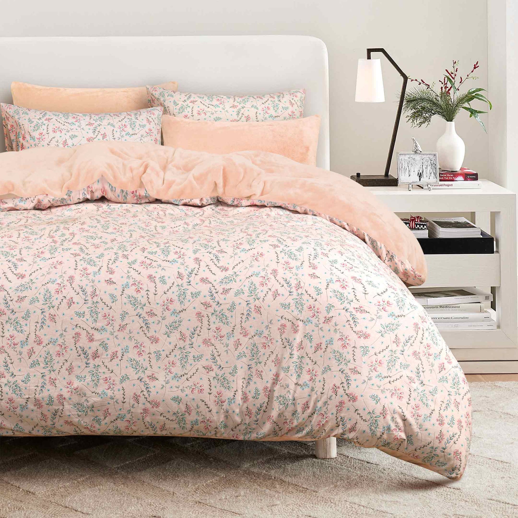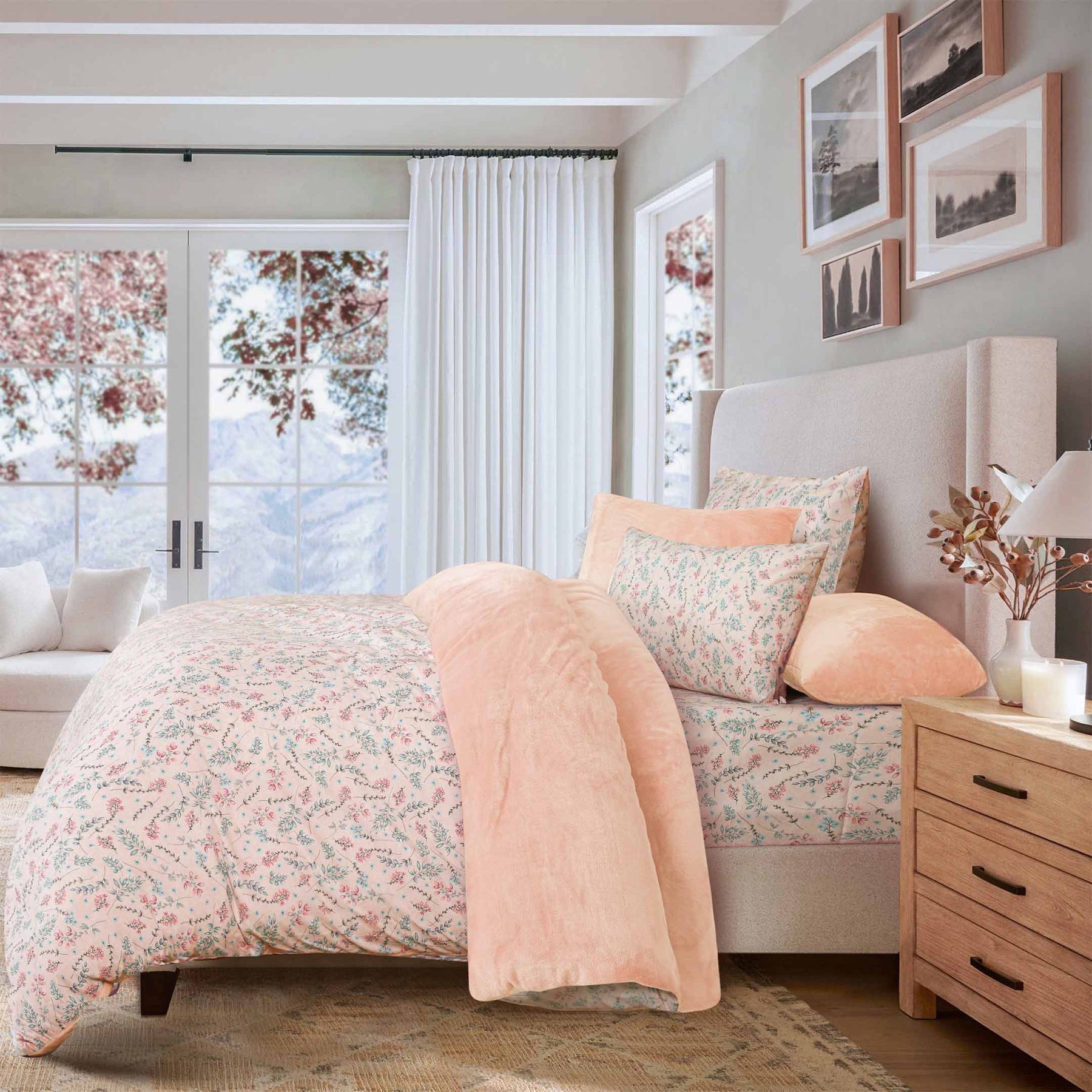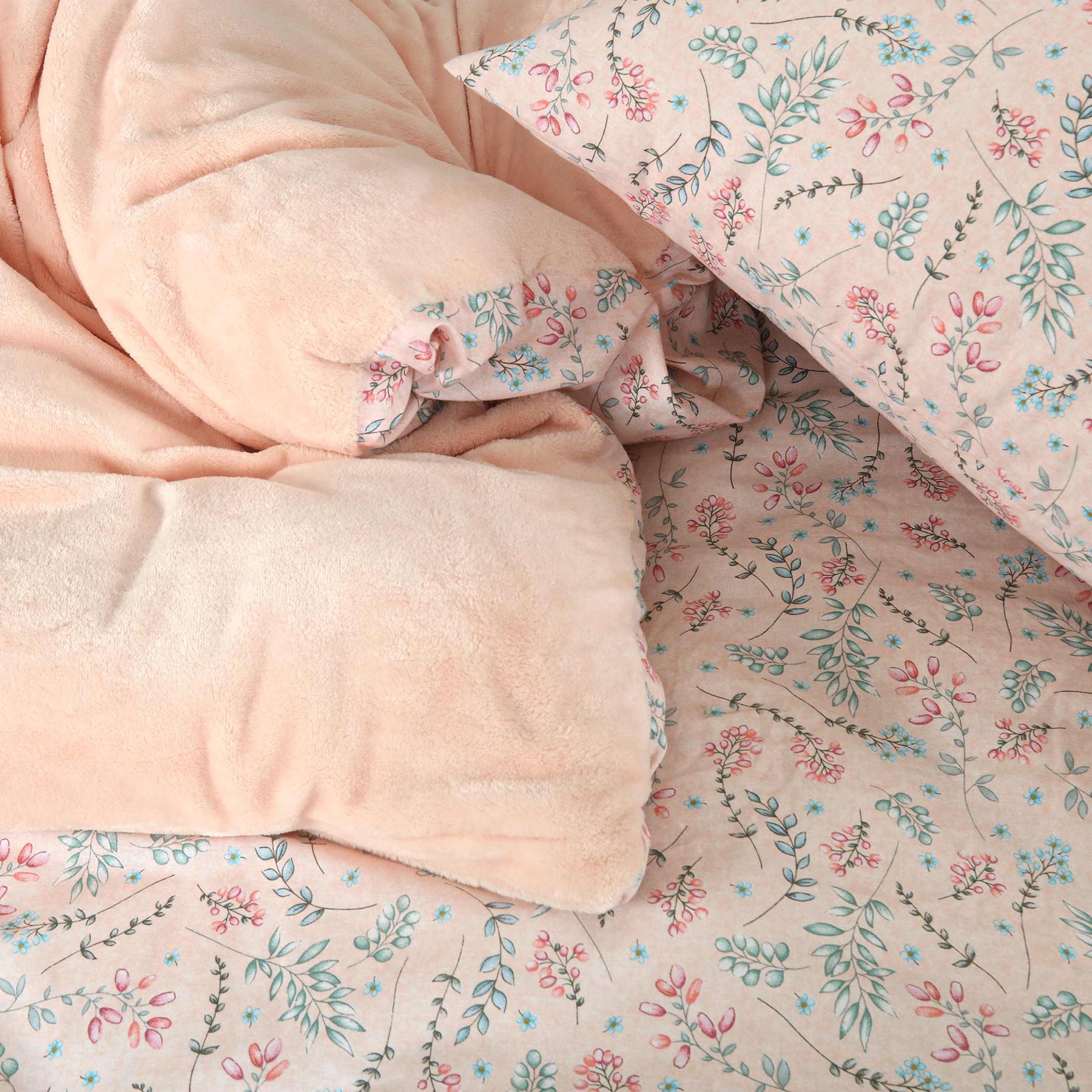 Add a touch of softness to your bedroom with the "Whispering Petals" Razaye set. The delicate pastel design showcases tiny, intricate floral branches in shades of pink and blue, set against a soothing blush backdrop. This elegant print radiates a calm and peaceful vibe, making it ideal for a cozy, inviting space. Perfect for those who seek timeless elegance combined with comfort.