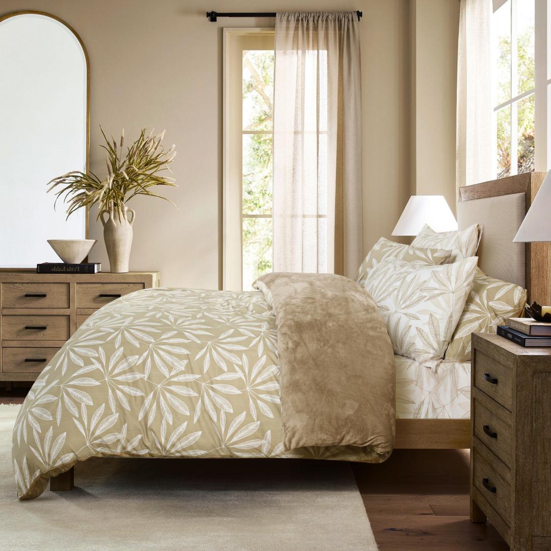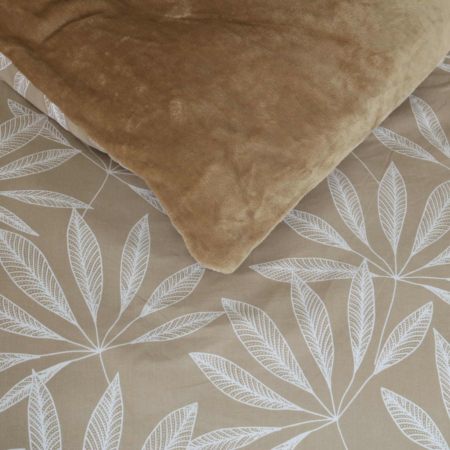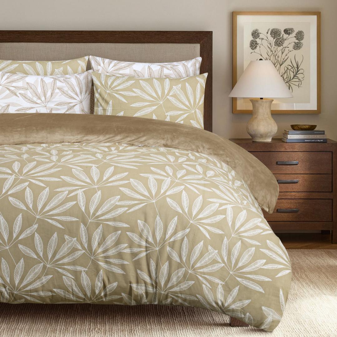 A soft beige background is overlaid with fine, white line-drawn leaf patterns. The light color scheme creates a soothing effect Ideal for minimalist and modern interiors; this pattern promotes a serene atmosphere, perfect for creating a peaceful Vibe in the bedroom. The design features overlapping, thinly outlined leaves that are randomly arranged across the fabric. The leaves are delicately sketched, giving a hand-drawn appearance that adds to the design's organic and natural feel. The subtle variations in leaf sizes and the interplay of light and shadow create a sense of depth without overwhelming the eye.