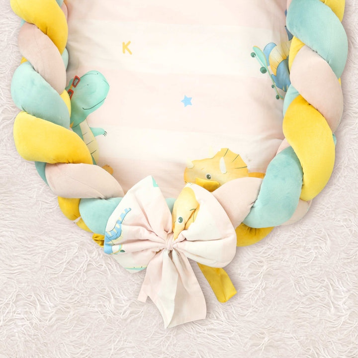 Wrap your little one in the comfort and cuteness of our Little Dino Braided Snuggle Bed. This cozy baby bed features a charming dinosaur-themed design, perfect for adding a touch of adventure to your nursery. The soft and colorful braided bumper offers a protective and comfortable environment for your baby to sleep or relax. The playful dinosaur plush adds an extra layer of fun, making this bed a delightful spot for your baby to snuggle up. Ideal for newborns and infants, it's designed with care to ensure your baby feels safe and secure.