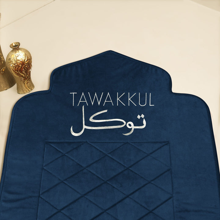 This luxury prayer mat with tawakkul embroidered on it is padded, and ensures no shock on prostration