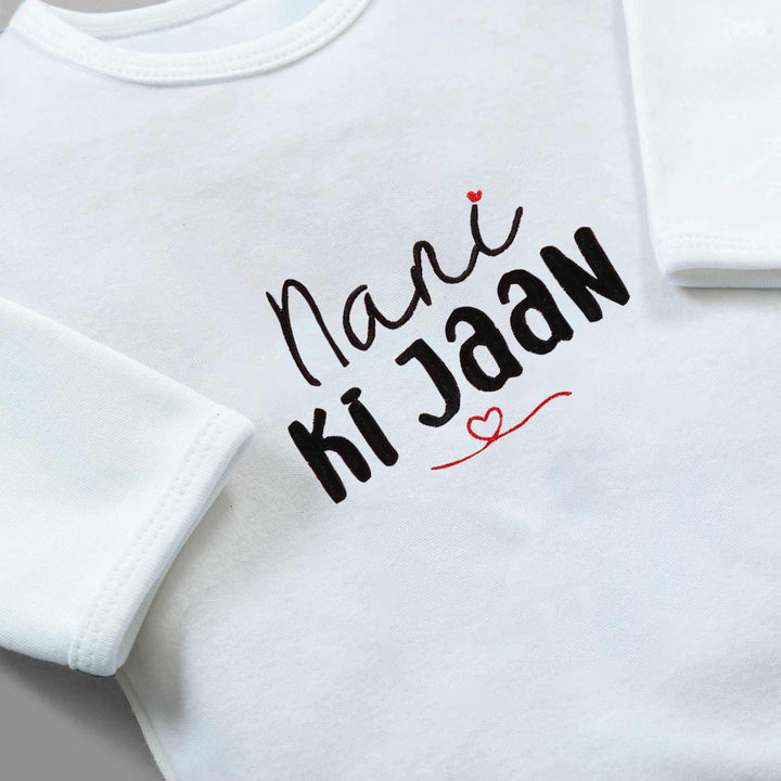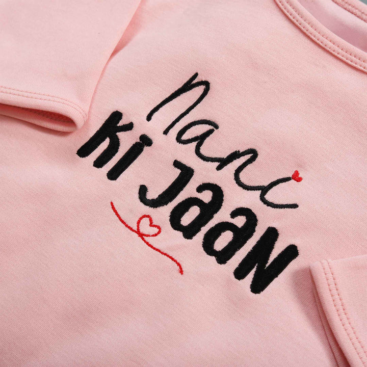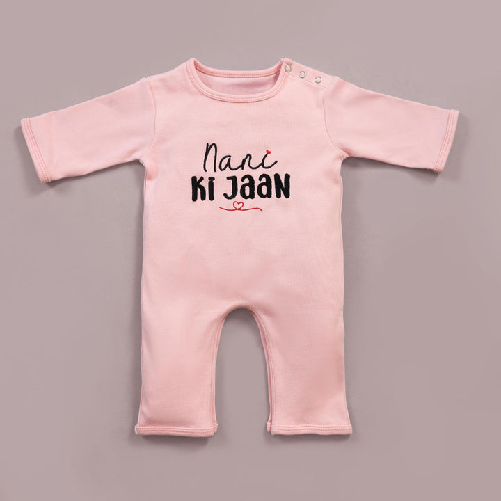 Introducing our Nani ki Jaan Embroidered Baby Romper! This adorable outfit features delicate embroidery with the sweet phrase "Nani ki Jaan". Made from soft, breathable fabric for your baby's comfort, it's perfect for any occasion. Easy snap closures make dressing a breeze. Get this charming romper today and add a touch of love to your little one's wardrobe!