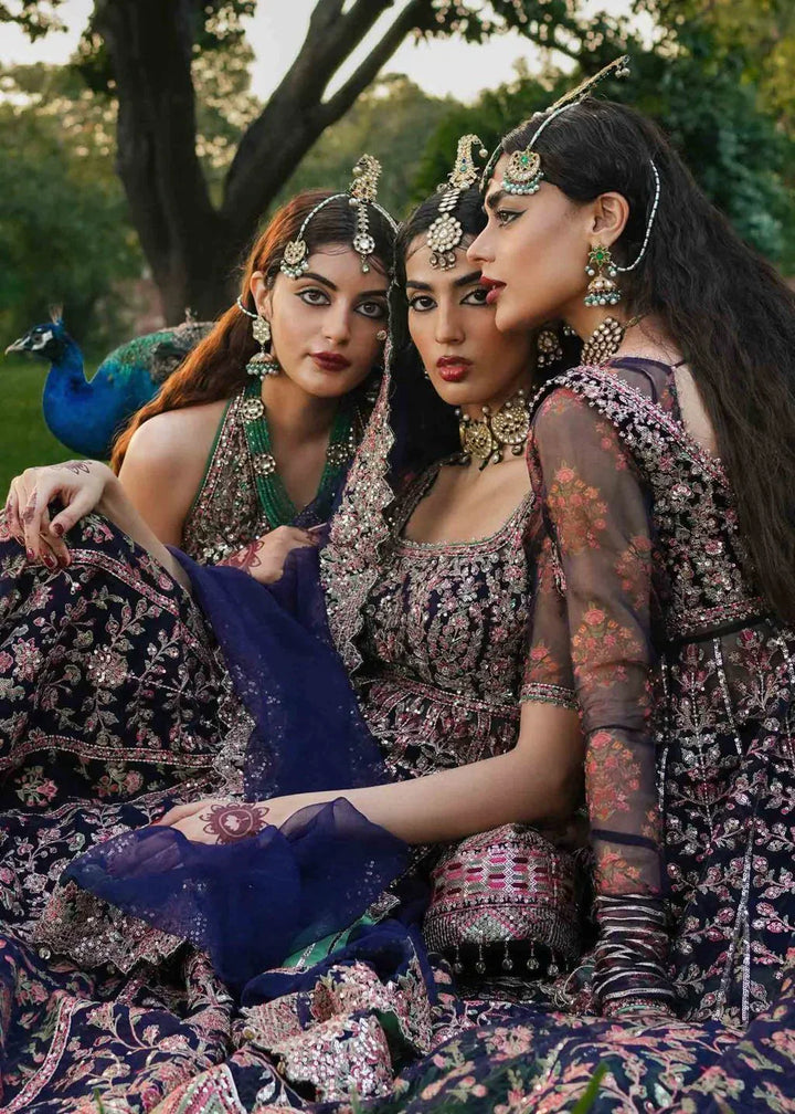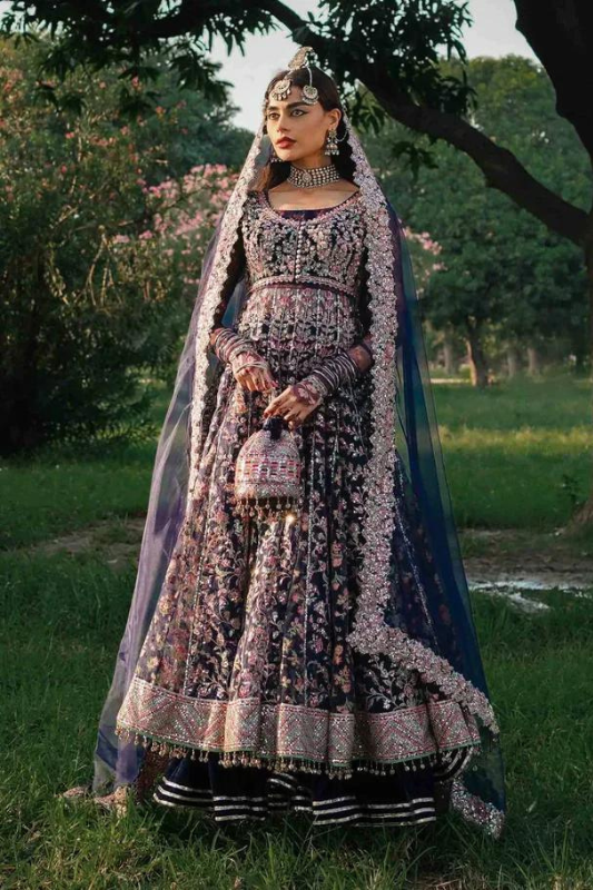 Navy Blue Organza peshwas is a reminiscient of the mughal times with its finest artistry. Exquisitely embroidered and embellished koti decked with floral galore and intricate jaal in hues of pastel pink and green, layered with gold tilla and sequins. Further embellished with buggle beads and sequins. Paired up with velvet plazzo pants and embroidered Organza dupatta.